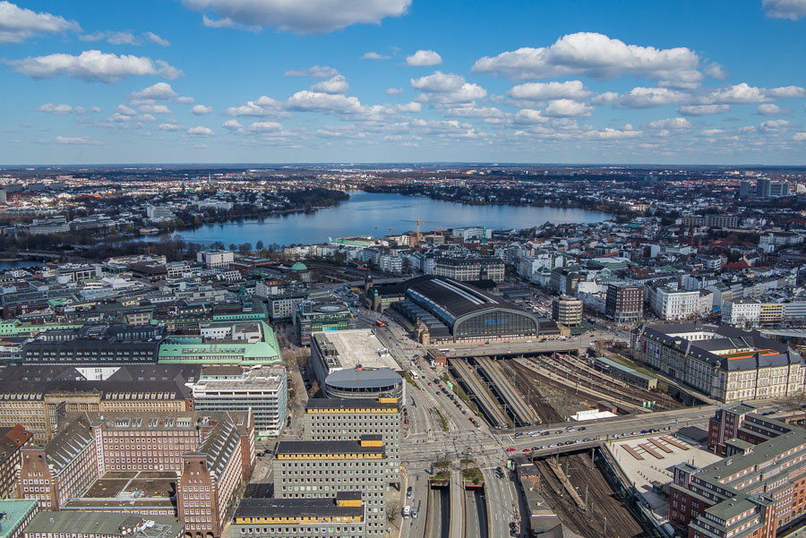 Ausblick vom High Flyer in Richtung Hauptbahnhof und Außenalster, 8. April 2012