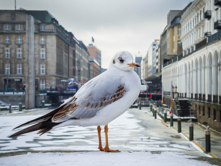 Lachmöwe auf dem Geländer der Reesendammbrücke , 27. Januar 2014