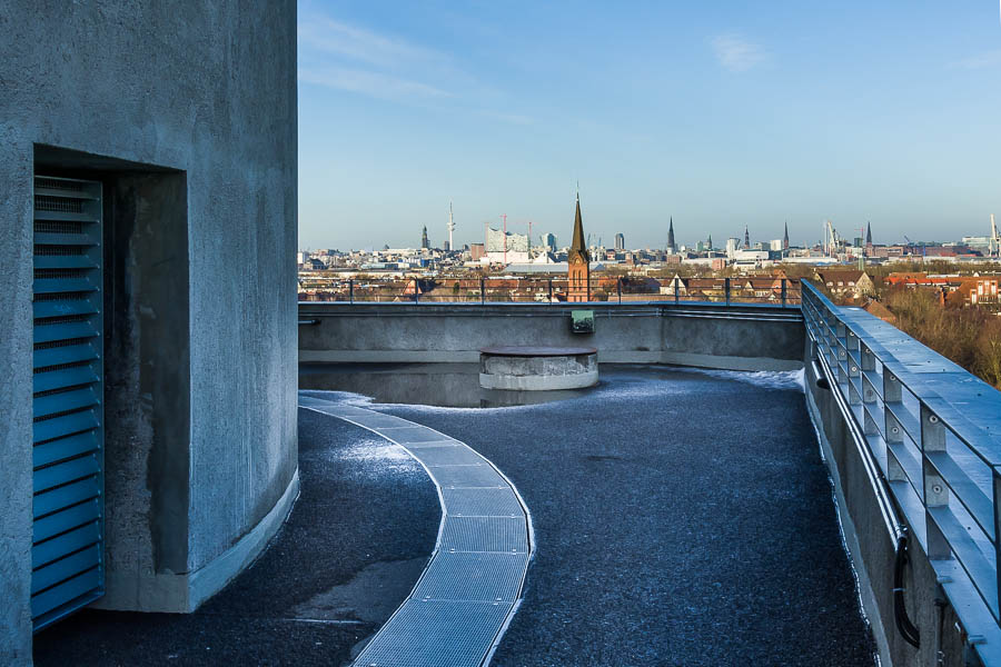 Blick über die Dächer Hamburgs vom Energie-Bunker in Wilhelmsburg, Neuhöfer Straße , 2. Februar 2014