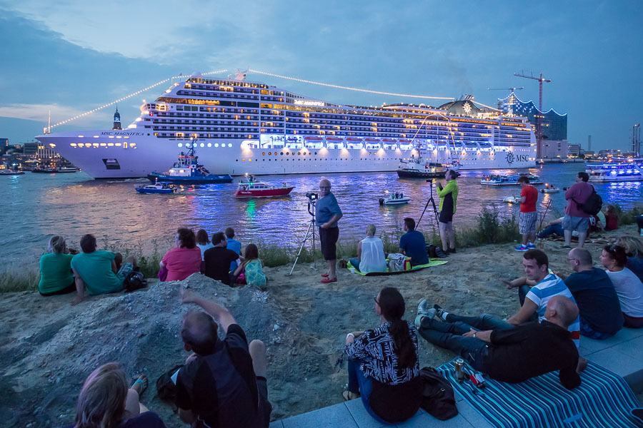 "Der Hafen in blauem Licht" - MSC Magnifica vor der Elbphilharmonie, 2. August 2014