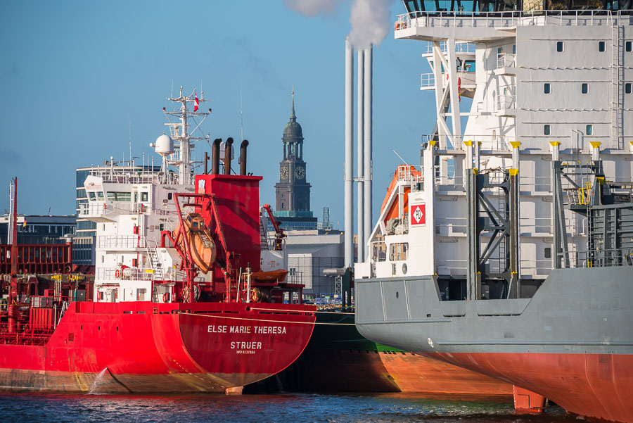 "Der Michel steht mittendrin" - Blick vom Schumacherwerder über die Norderelbe, 4. Januar 2015