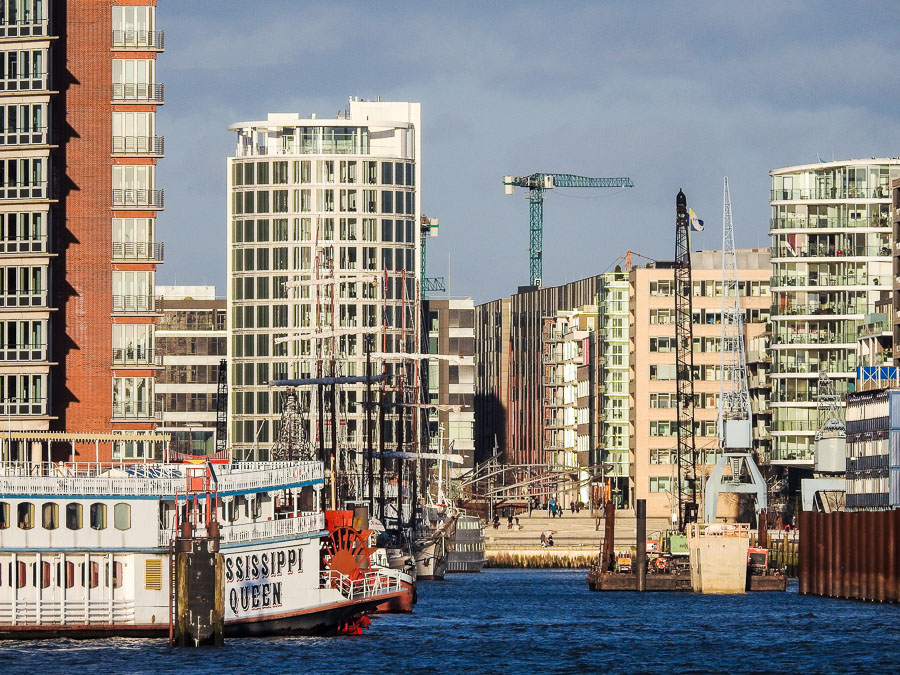 "Hafencity" - Blick von der Elbe in Richtung Magellanterrassen , 3. April 2015