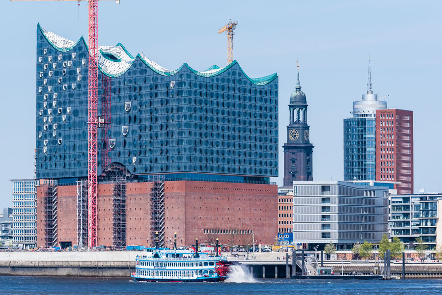 "Elbphilharmonie, Michel, HTC-Tower" - Blick über die Elbe von den 50er Schuppen aus , 3. Mai 2015