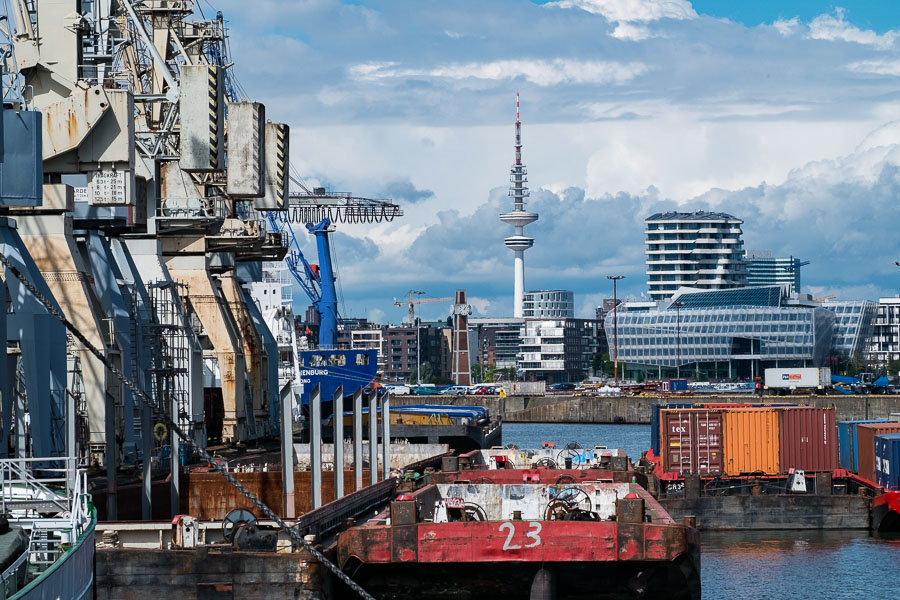 Blick in den Hansahafen / im Hintergrund, der Heinrich-Hertz-Turm (Tele-Michel), 14. August 2016