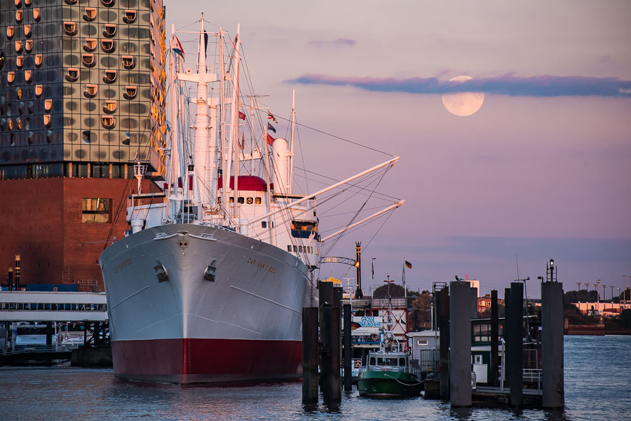 Elbphilharmonie / Cap San Diego / Mondaufgang über der Norderelbe, 17. August 2016