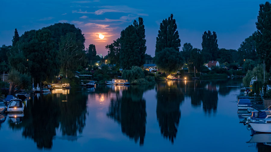 Mondaufgang über der Bille / Billerhuder Insel / Braune Brücke, 19. August 2016