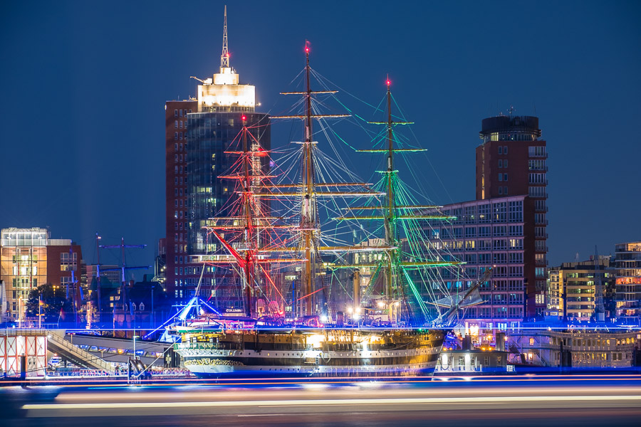 "Großsegler Amerigo Vespucci" beleuchtet in den italienischen Nationalfarben / Überseebrücke , 19. August 2018